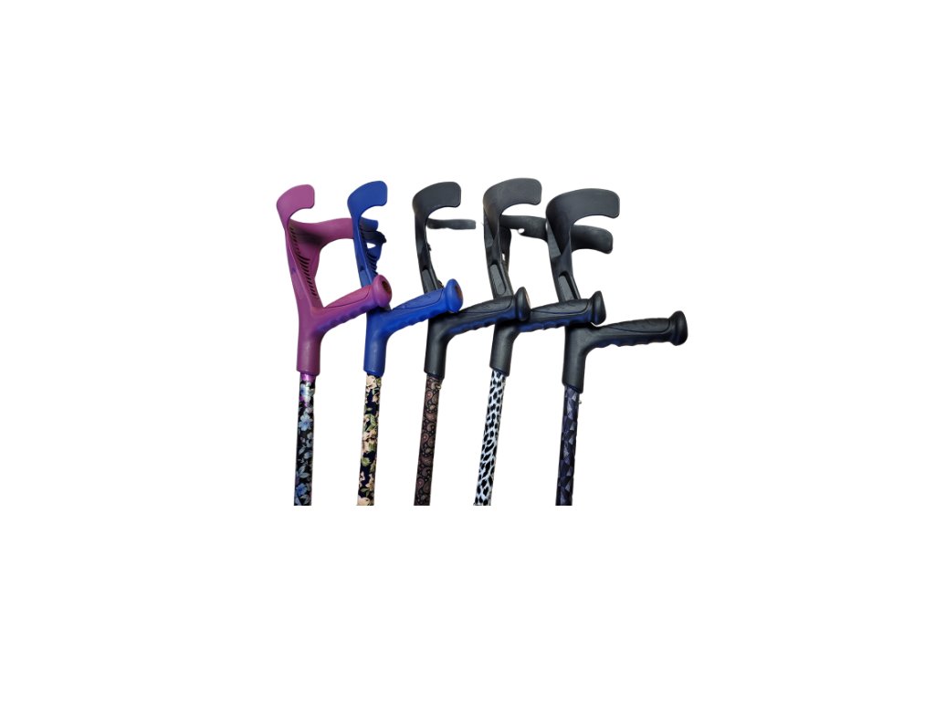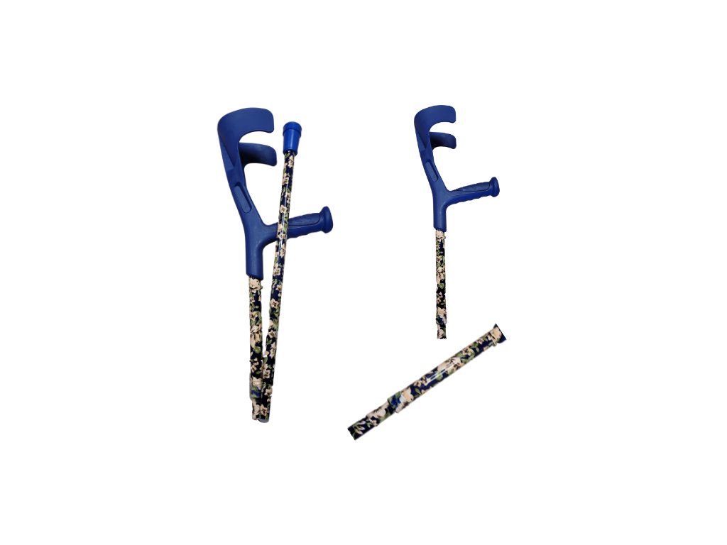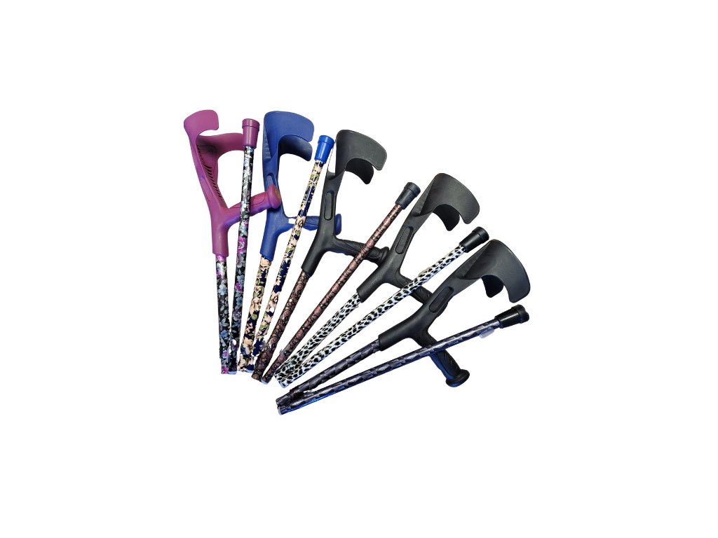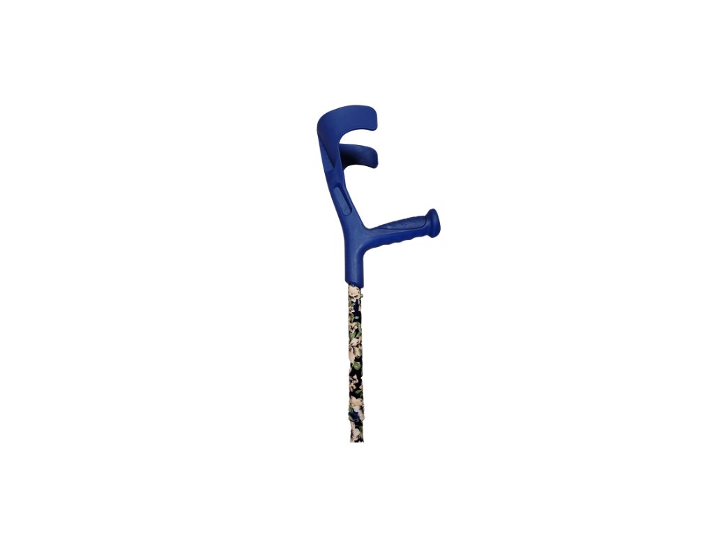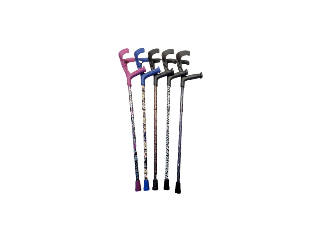 Skládací francouzská berle, výškově stavitelná. Lze jednoduše tahem rozložit na dvě části a ohnout (viz obrázek).