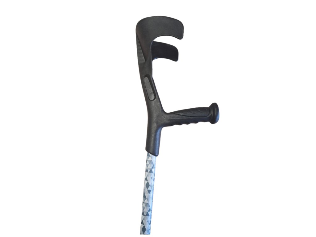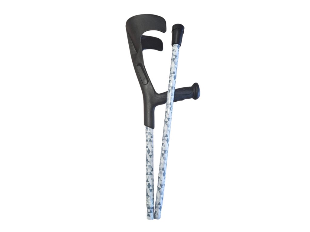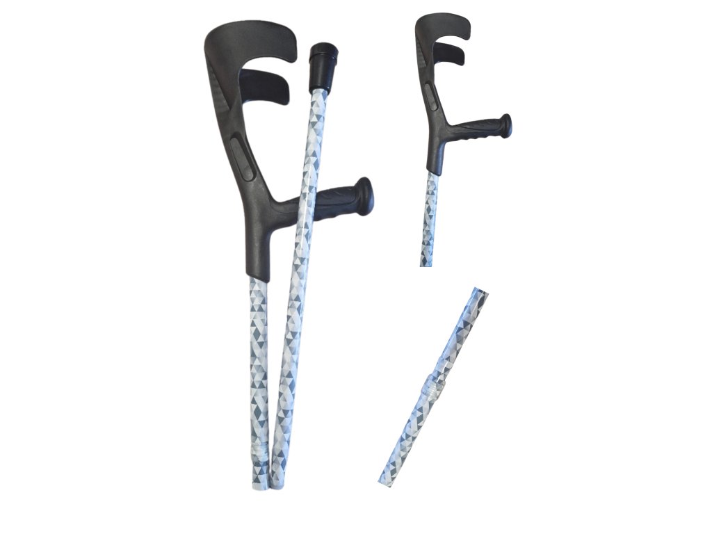 Skládací francouzská berle, výškově stavitelná. Lze jednoduše tahem rozložit na dvě části a ohnout (viz obrázek).