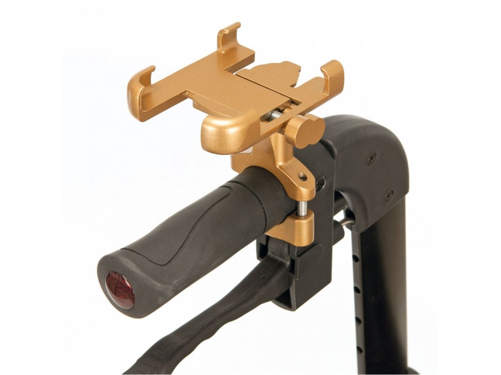 Držák mobilního telefonu k vozíkům a chodítkům. Nastavitelný dle telefonu, uchycení pomocí kulaté objímky