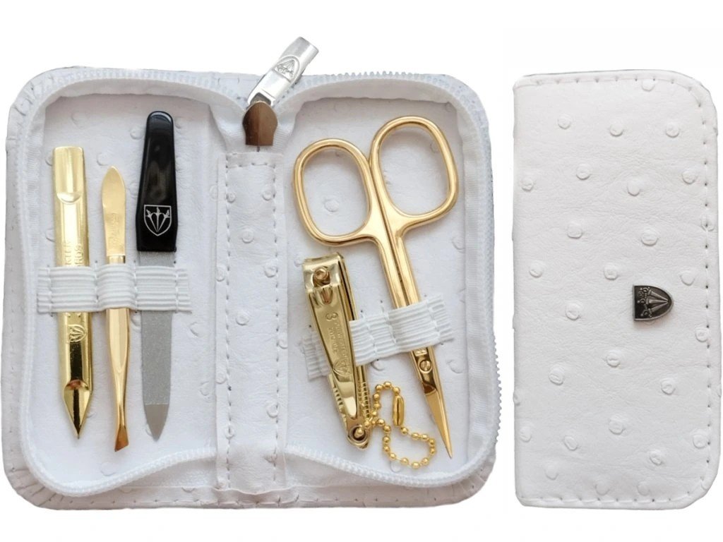 Luxusní sada na manikúru od německého výrobce Kellermann. Elegantní bílé pouzdro v designu pštrosí kůže v kombinaci s pozlacenými nástroji tvoří luxusní set, který zaručeně potěší každou ženu.