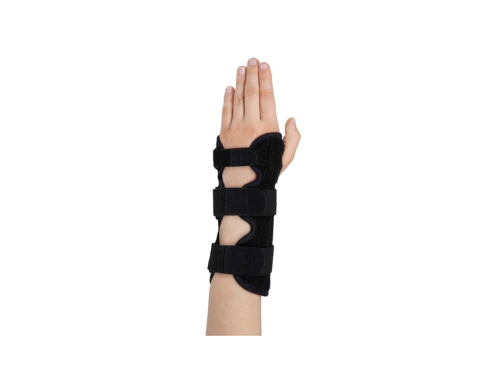 - Lehká ortéza zápěstí s volárně uloženou anatomicky profilovanou hliníkovou tvarovatelnou dlahou