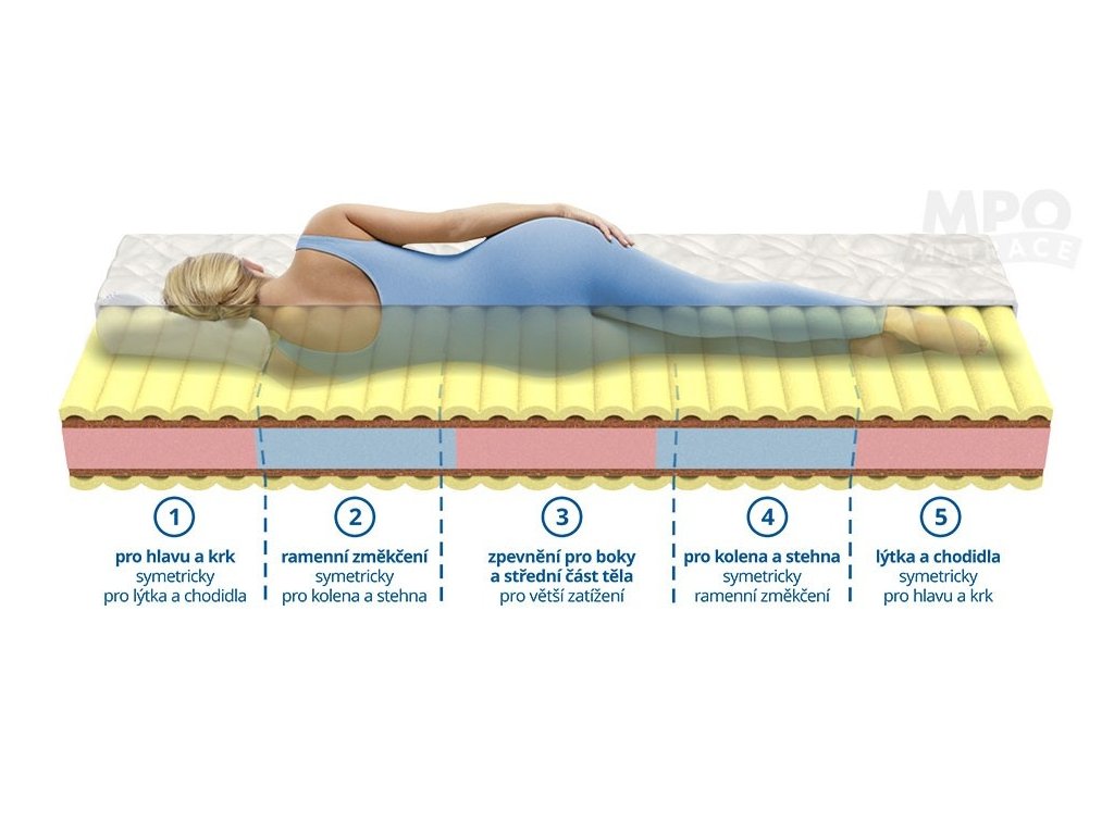 Matrace Meteora 1+1 s nosností 120 kg a výškou 16 cm vyniká příčnými masážními vlnami na lehacích plochách, které vás skvěle uvolní po celodenní námaze. Speciální profilování v kombinaci s přírodními kokosovými vlákny umožňuje protékání vzduchu matrací a její dokonalé provzdušnění pro maximální hygienu lůžka. Střed matrace s různě tuhými PUR pěnami zajišťuje 5 anatomických zón, díky nimž si na ní účinně odpočinete v každé pozici. Optimálně podepřou hlavu a krk, ramena, boky a střední část těla, kolena a stehna, lýtka a chodidla. Matraci Meteora vybavíte potahem podle přání a uložíte ji na všechny typy podložek.