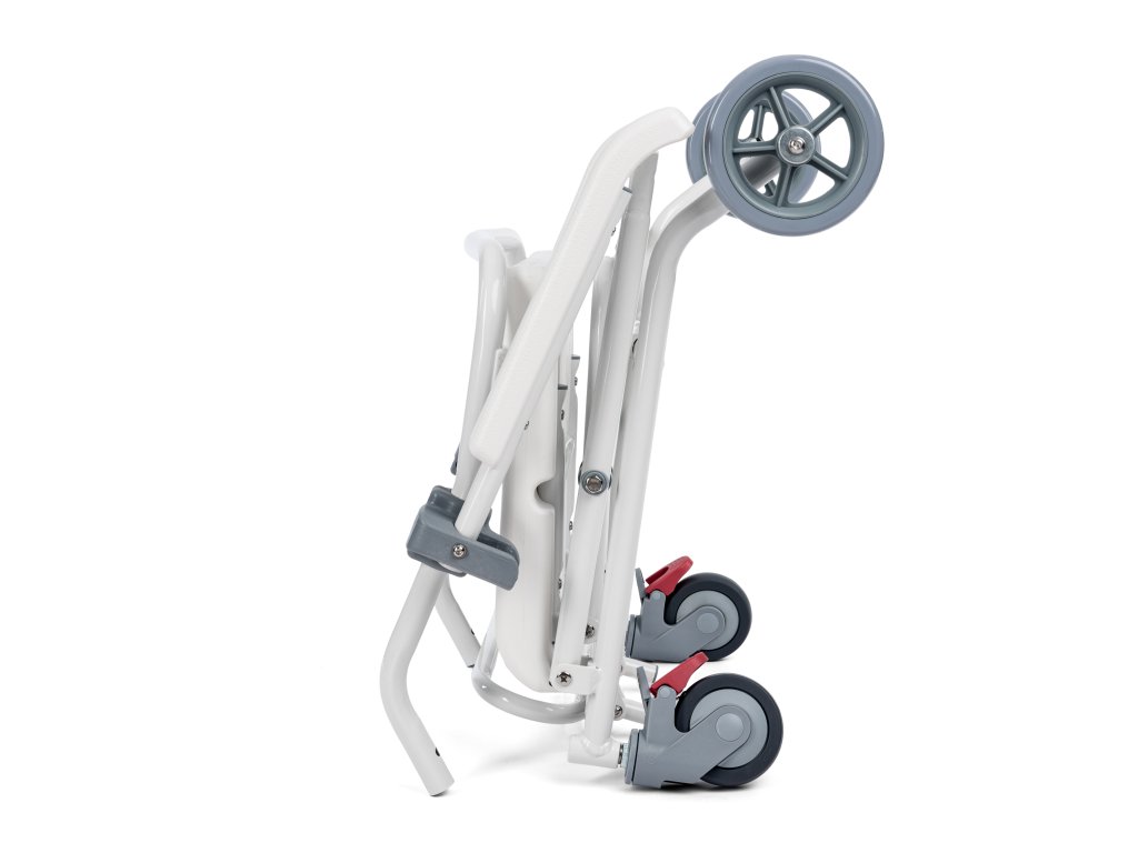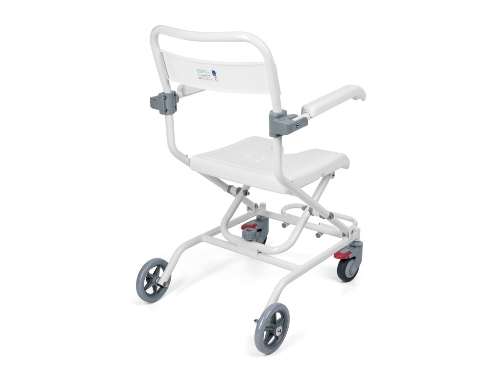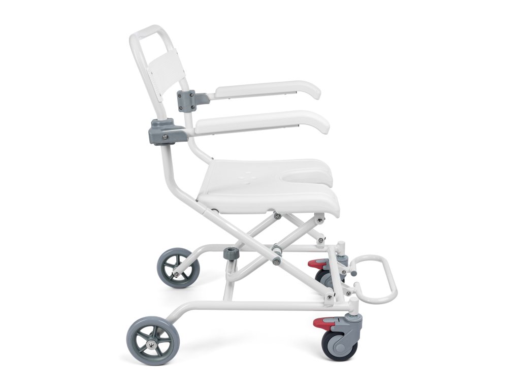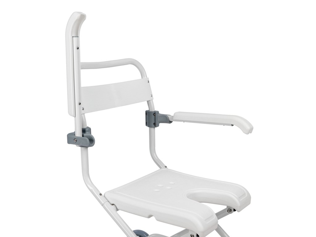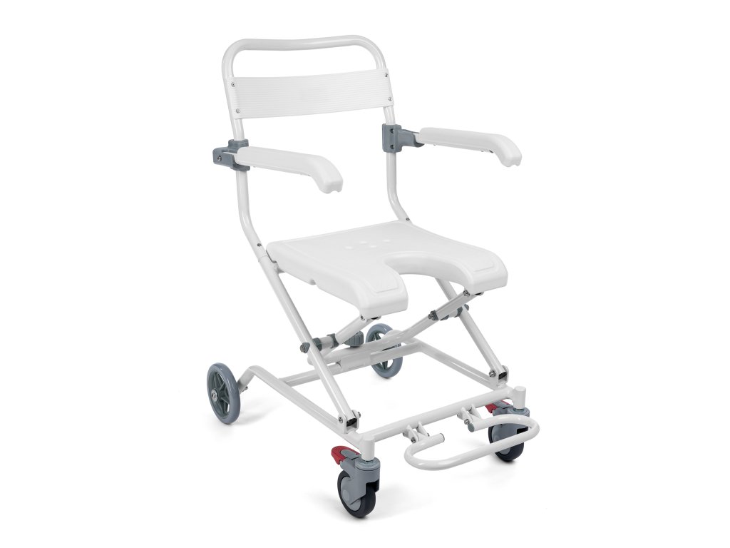 Rám křesla je vyroben z hliníku. Toaletní sedátko s výřezem ve tvaru U a opěrka jsou vyrobeny z odolného PVC. Má odklopné područky, sklopnou opěrku nohou, zadní plná 6 " kola a 4" přední kola s brzdou v otočných vidlicích.