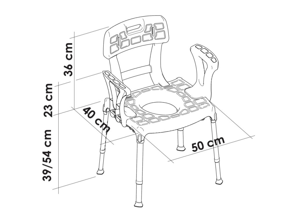 Židli lze jednoduše složit a rozložit bez použití nářadí a je tak vhodná i při přesunech z místa na místo. Díky modulárnímu systému je navíc možné použít jen samotnou sedačku a dle potřeby ji případně doplnit jednou nebo oběma područkami a opěrkou zad. Bez problémů si ji tak přizpůsobíte svým individuálním potřebám. Navíc ji lze použít také ke sprchování, po vyjmutí nádoby jako nástavec na WC nebo po doplnění polstrováním jako odpočinkovou židli.